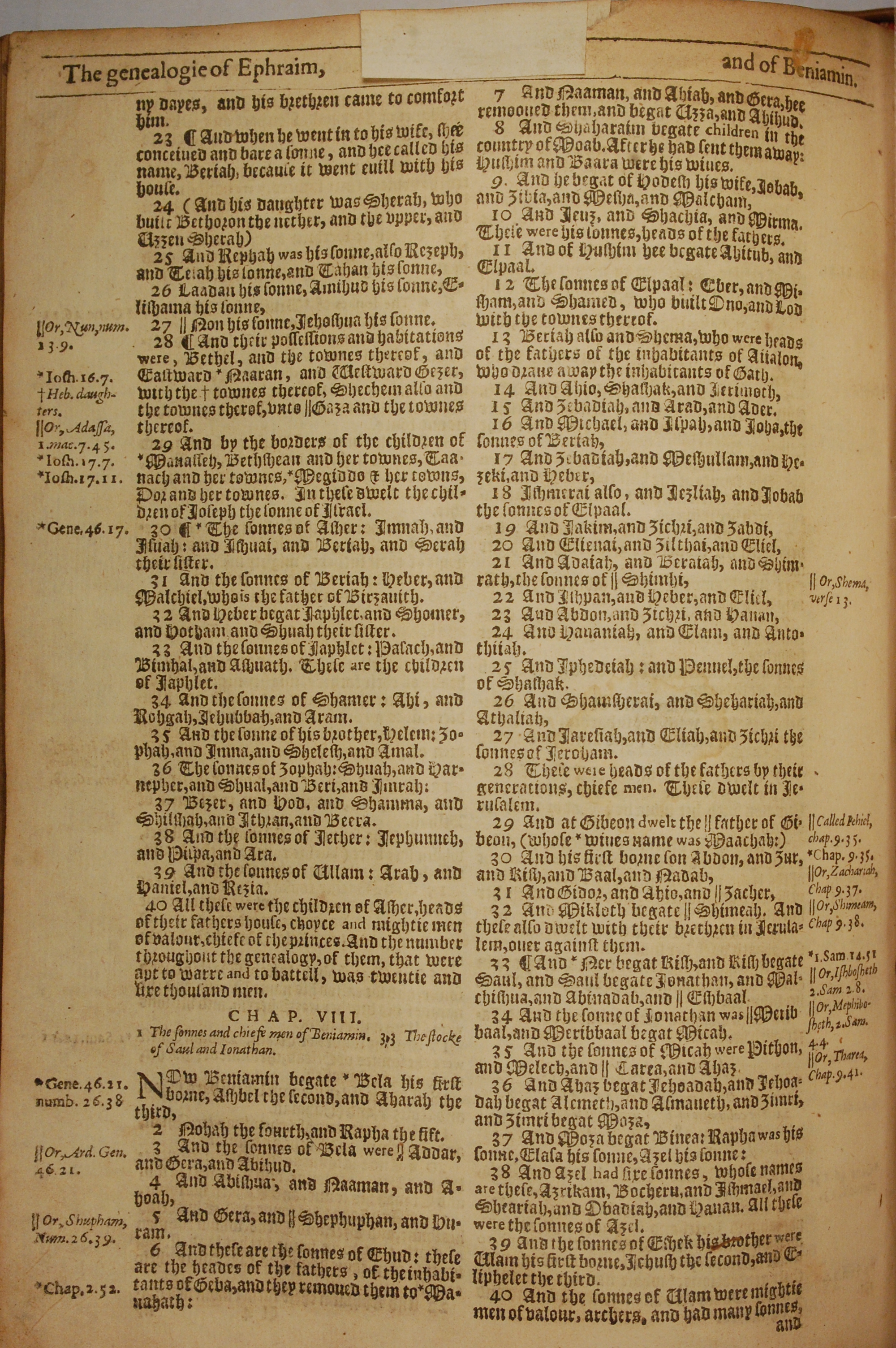 1613年The Genealogies recorded in the sacred scriptures 历代志上 7 章 23 节到 8 章 40 节