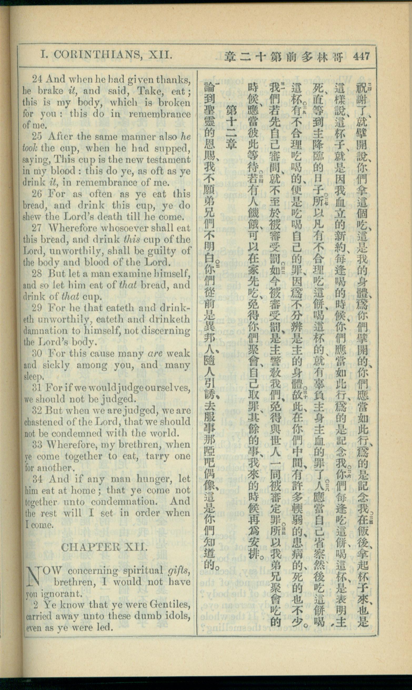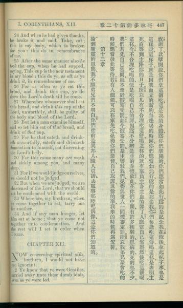 1908年新约全书(中西字) 哥林多前书 11 章 24 节到 12 章 2 节