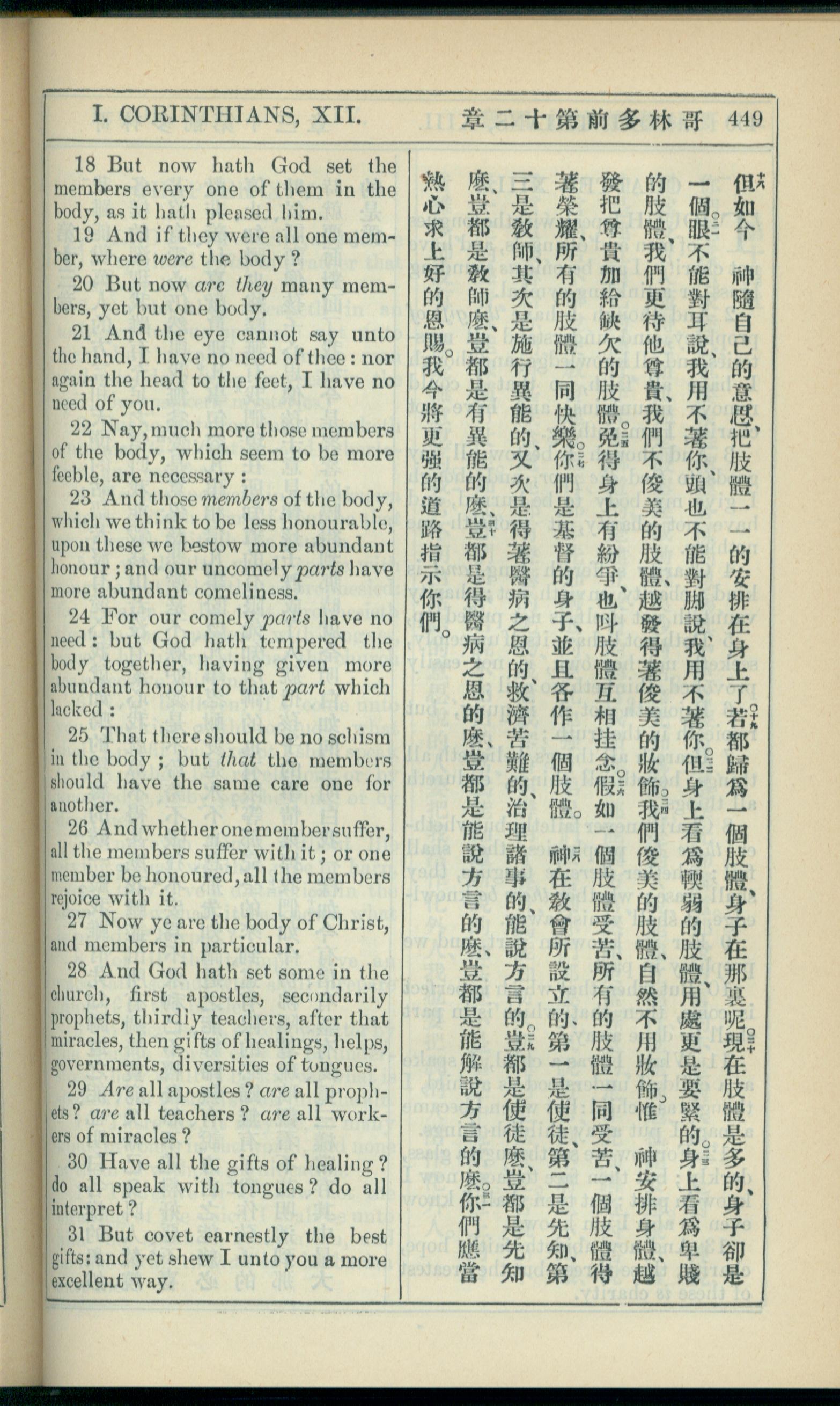 1908年新约全书(中西字) 哥林多前书 12 章 18 节到 12 章 31 节