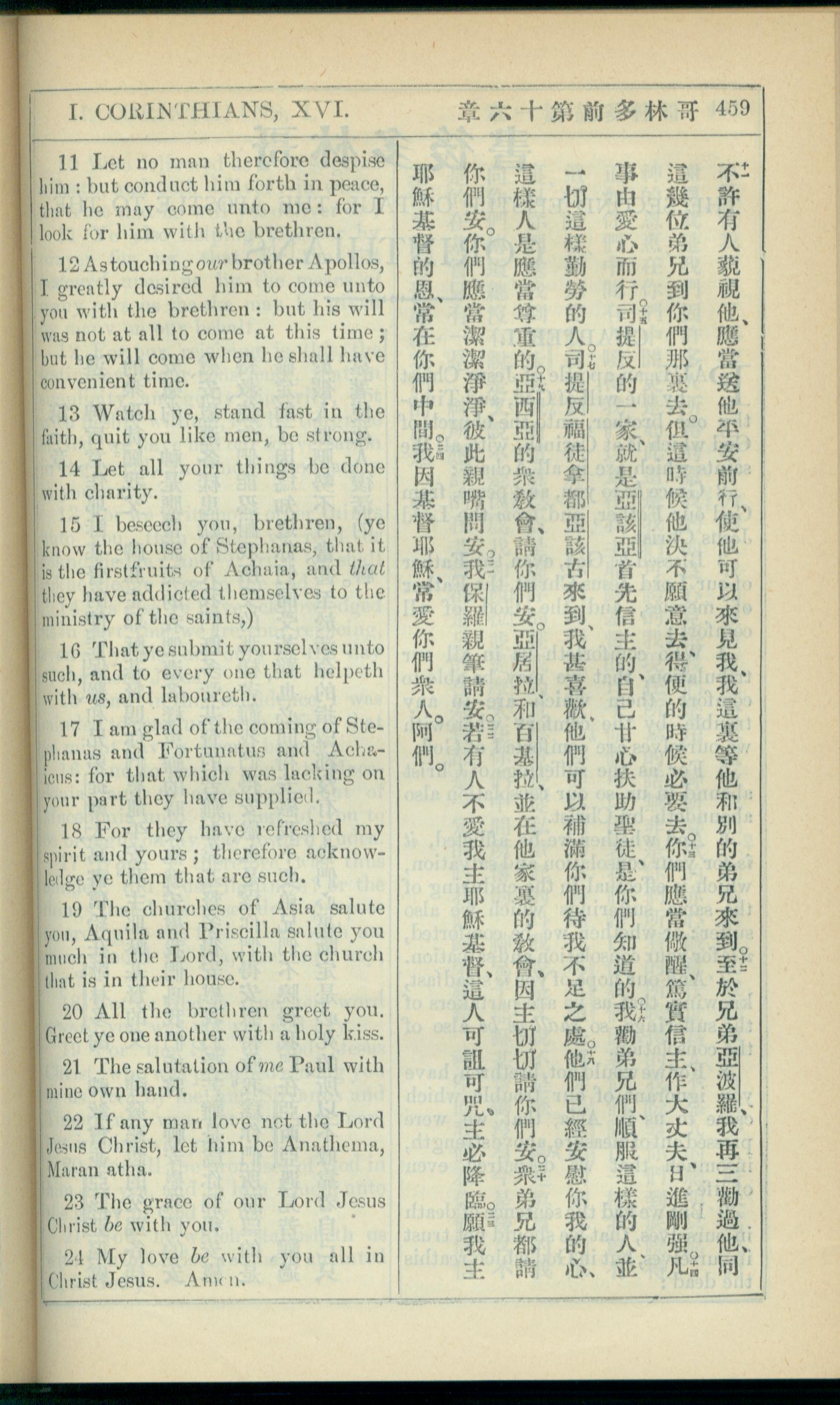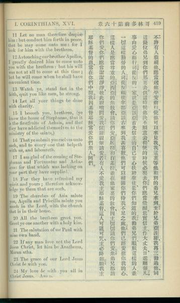 1908年新约全书(中西字) 哥林多前书 16 章 11 节到 16 章 24 节
