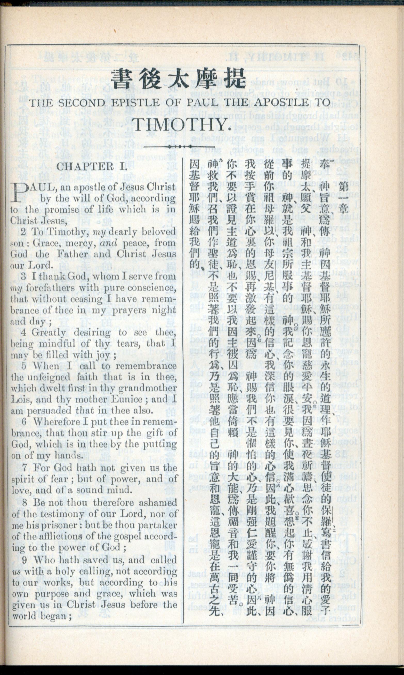 1908年新约全书(中西字) 提摩太后书 1 章 1 节到 1 章 9 节