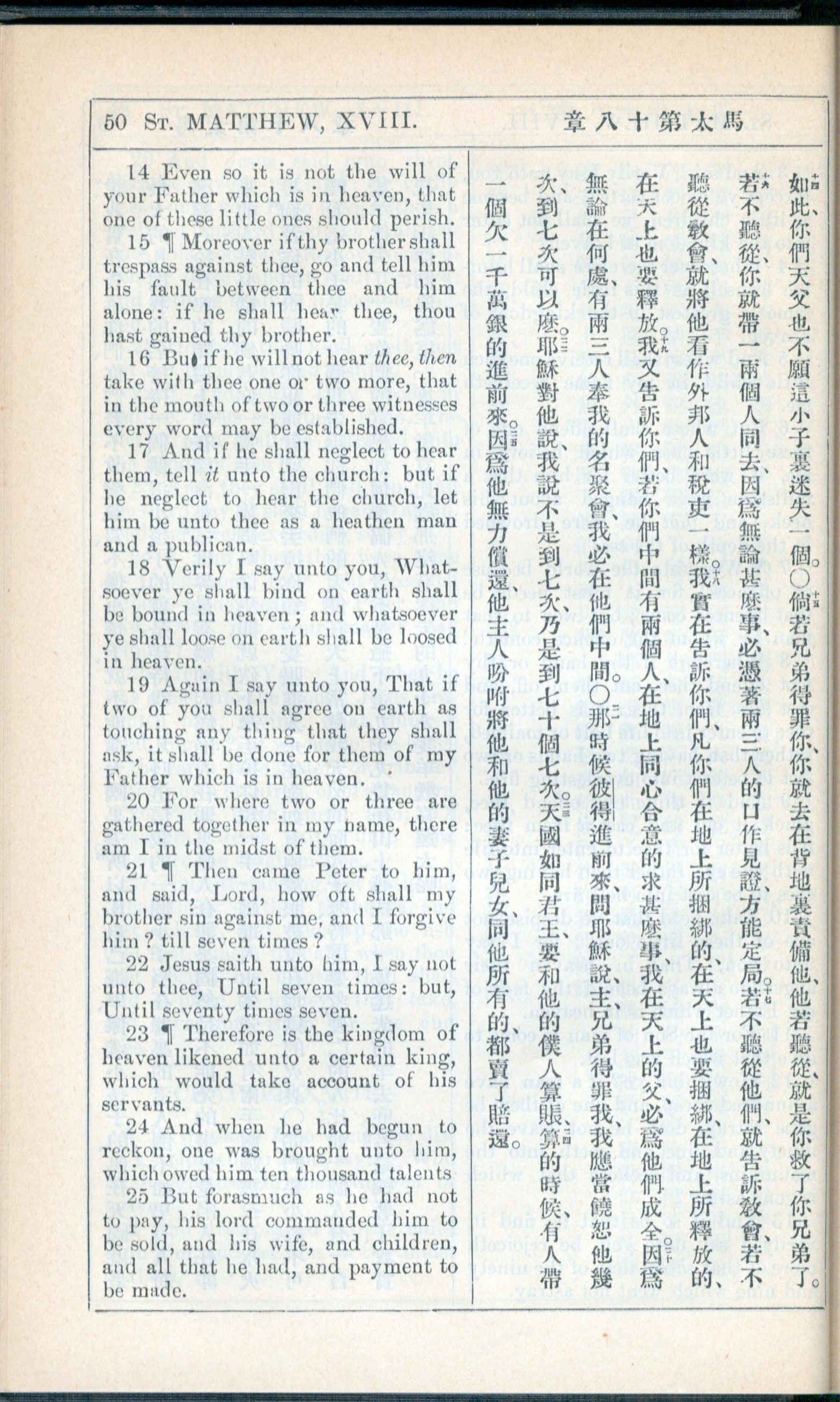 1908年新约全书(中西字) 马太福音 18 章 14 节到 18 章 25 节