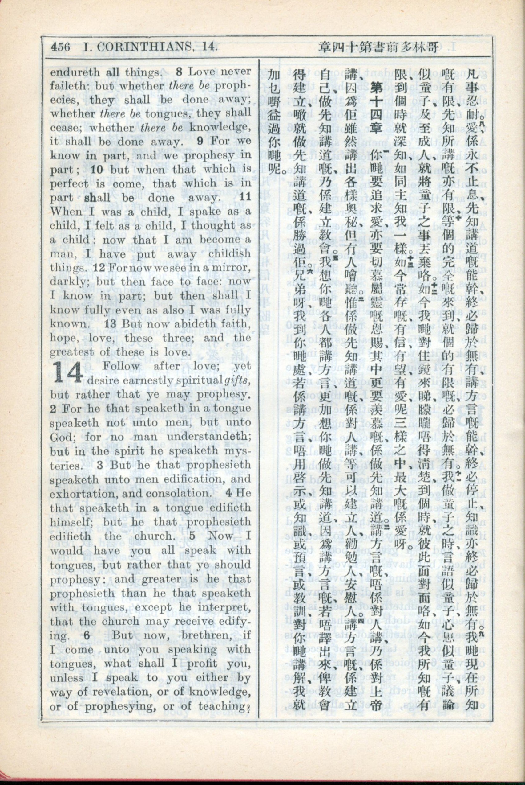1931年新约全书广东话新译本与美国新译英文 哥林多前书 13 章 8 节到 14 章 6 节