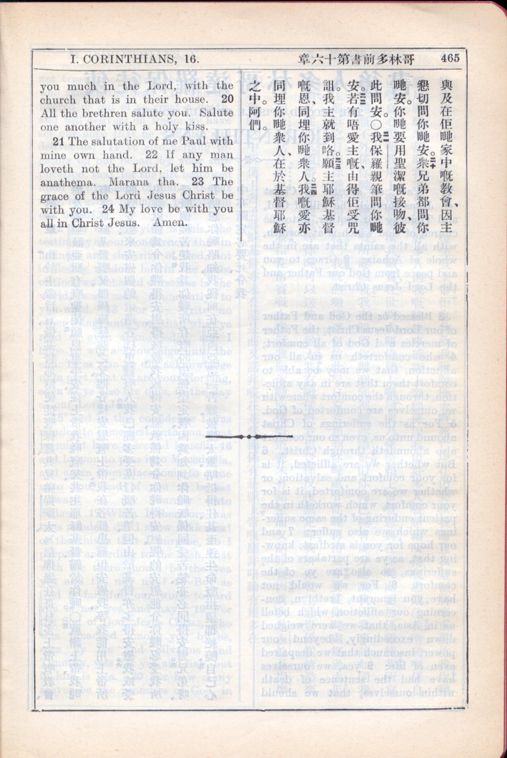 1931年新约全书广东话新译本与美国新译英文 哥林多前书 16 章 20 节到 16 章 24 节