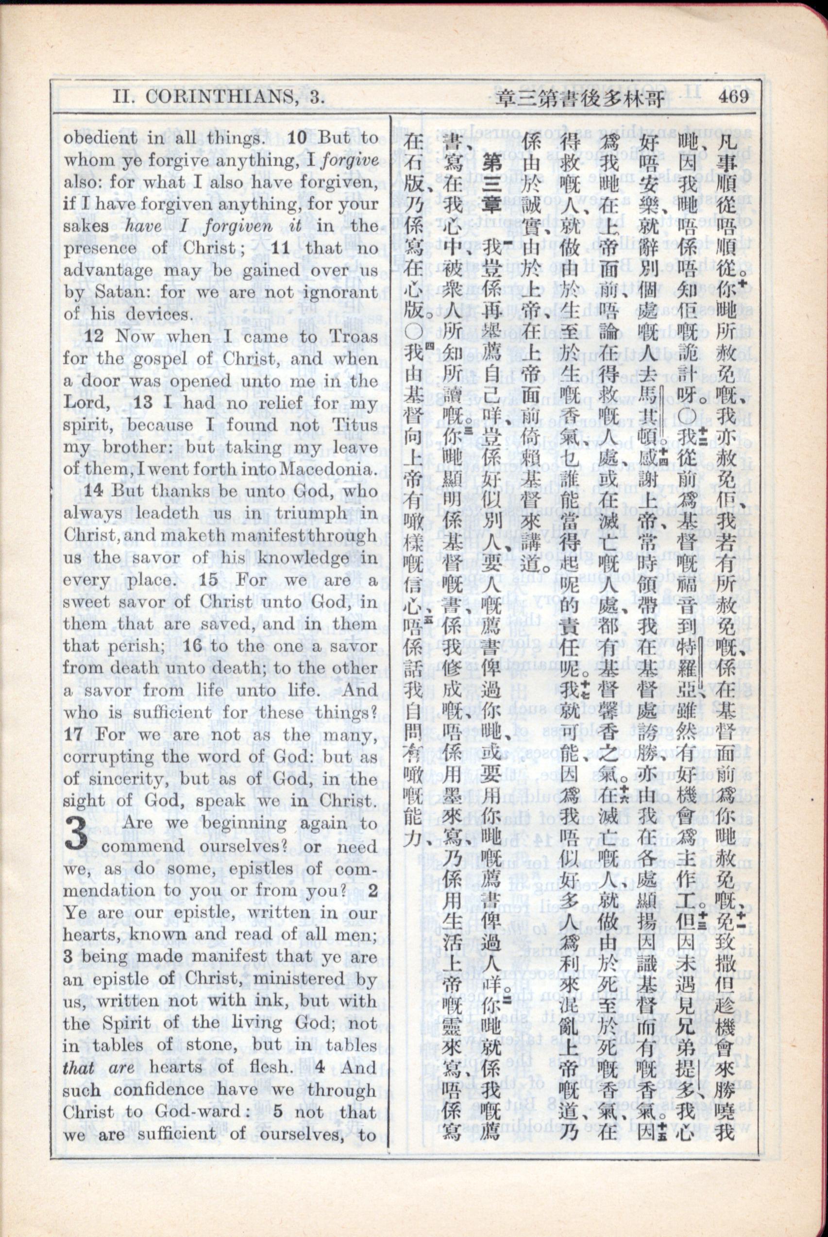 1931年新约全书广东话新译本与美国新译英文 哥林多后书 2 章 10 节到 3 章 5 节