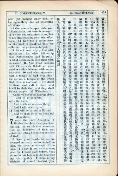 1931年新约全书广东话新译本与美国新译英文 哥林多后书 6 章 11 节到 7 章 4 节