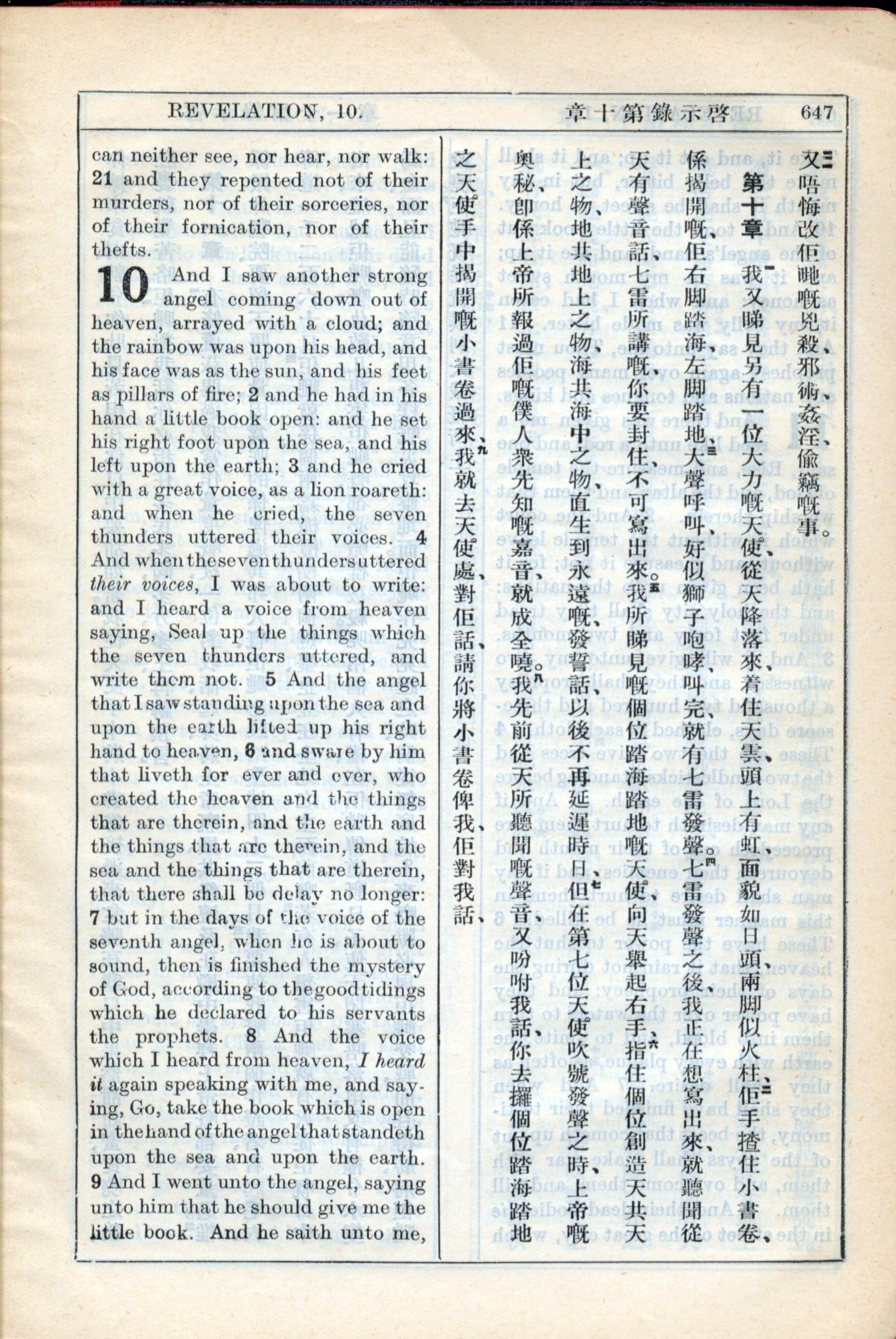 1931年新约全书广东话新译本与美国新译英文 启示录 9 章 21 节到 10 章 9 节