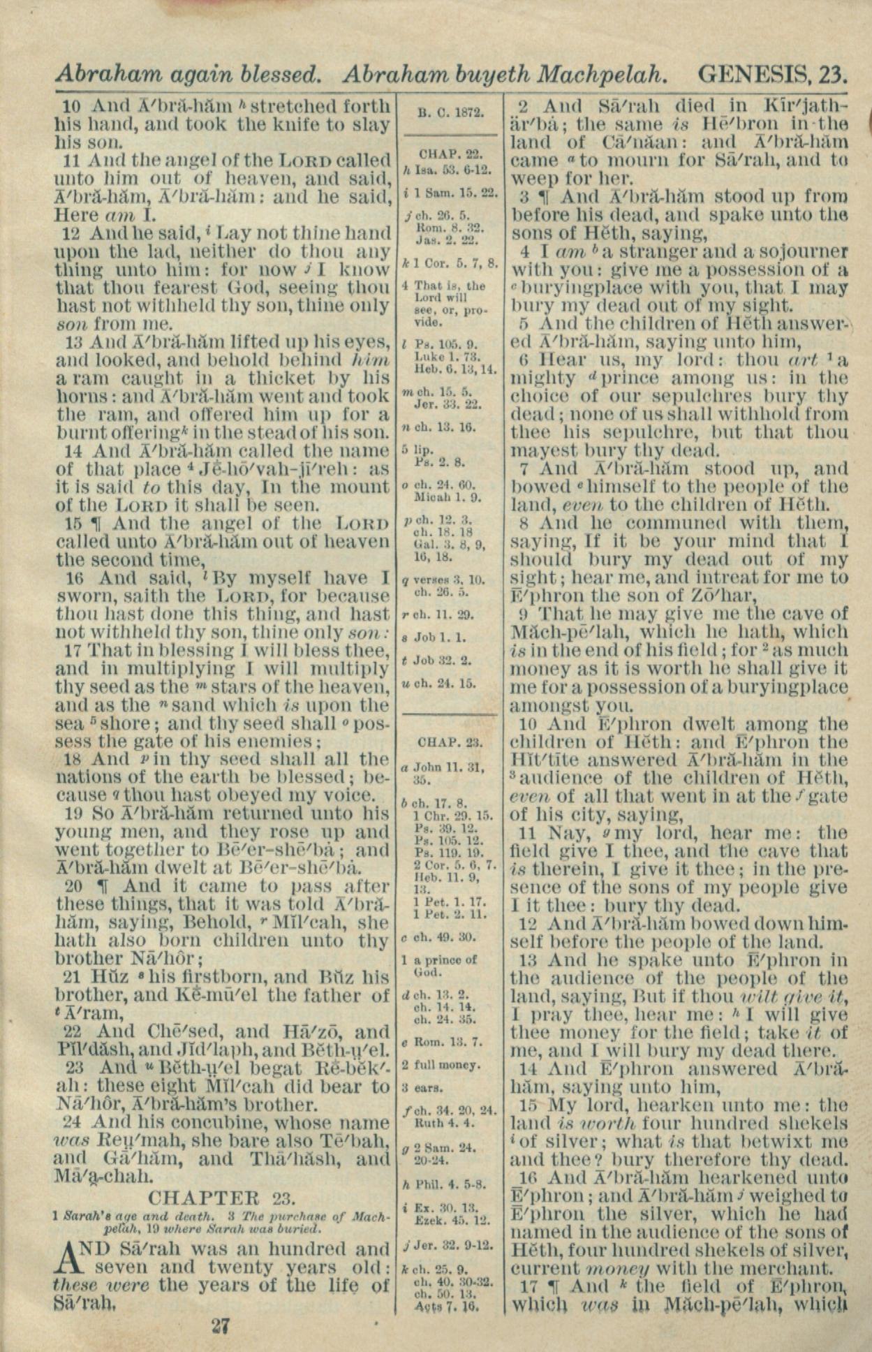 1916年Holy Bible 创世记 22 章 10 节到 23 章 17 节