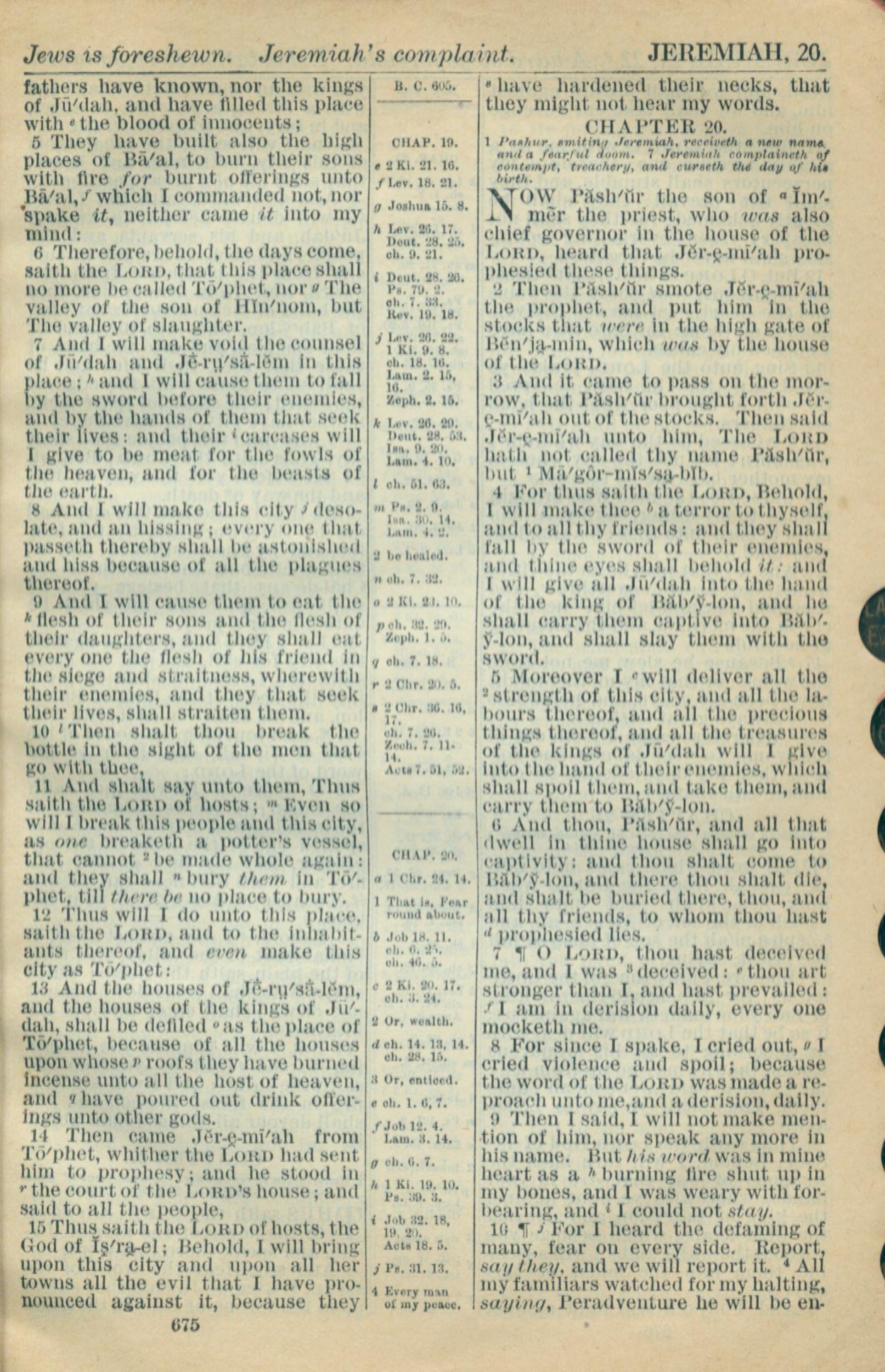 1916年Holy Bible 耶利米书 19 章 5 节到 20 章 10 节