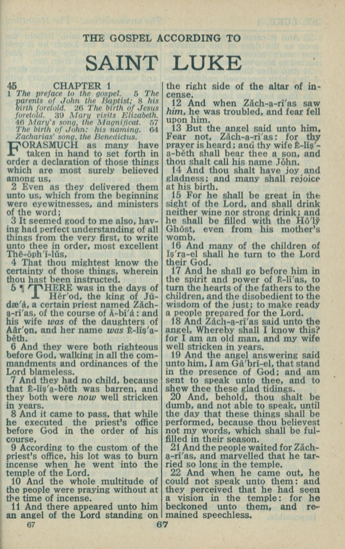 1946年King James Version 路加福音 1 章 1 节到 1 章 22 节