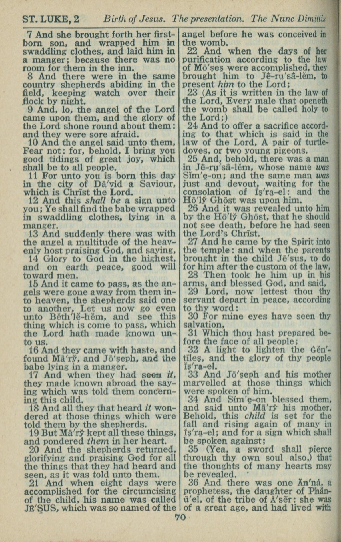 1946年King James Version 路加福音 2 章 7 节到 2 章 36 节