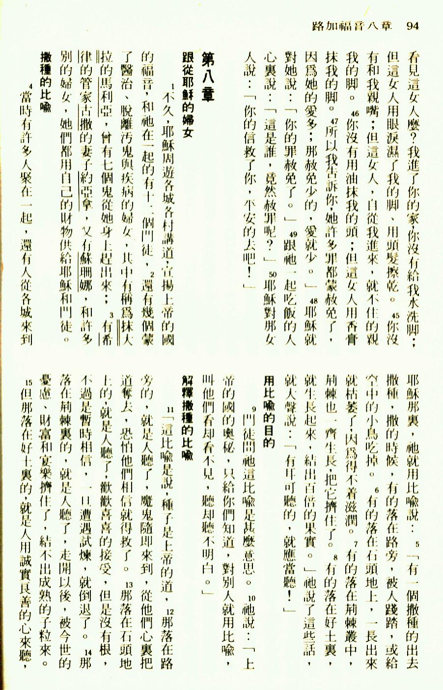1976年圣经新译本新约 路加福音 7 章 45 节到 8 章 15 节