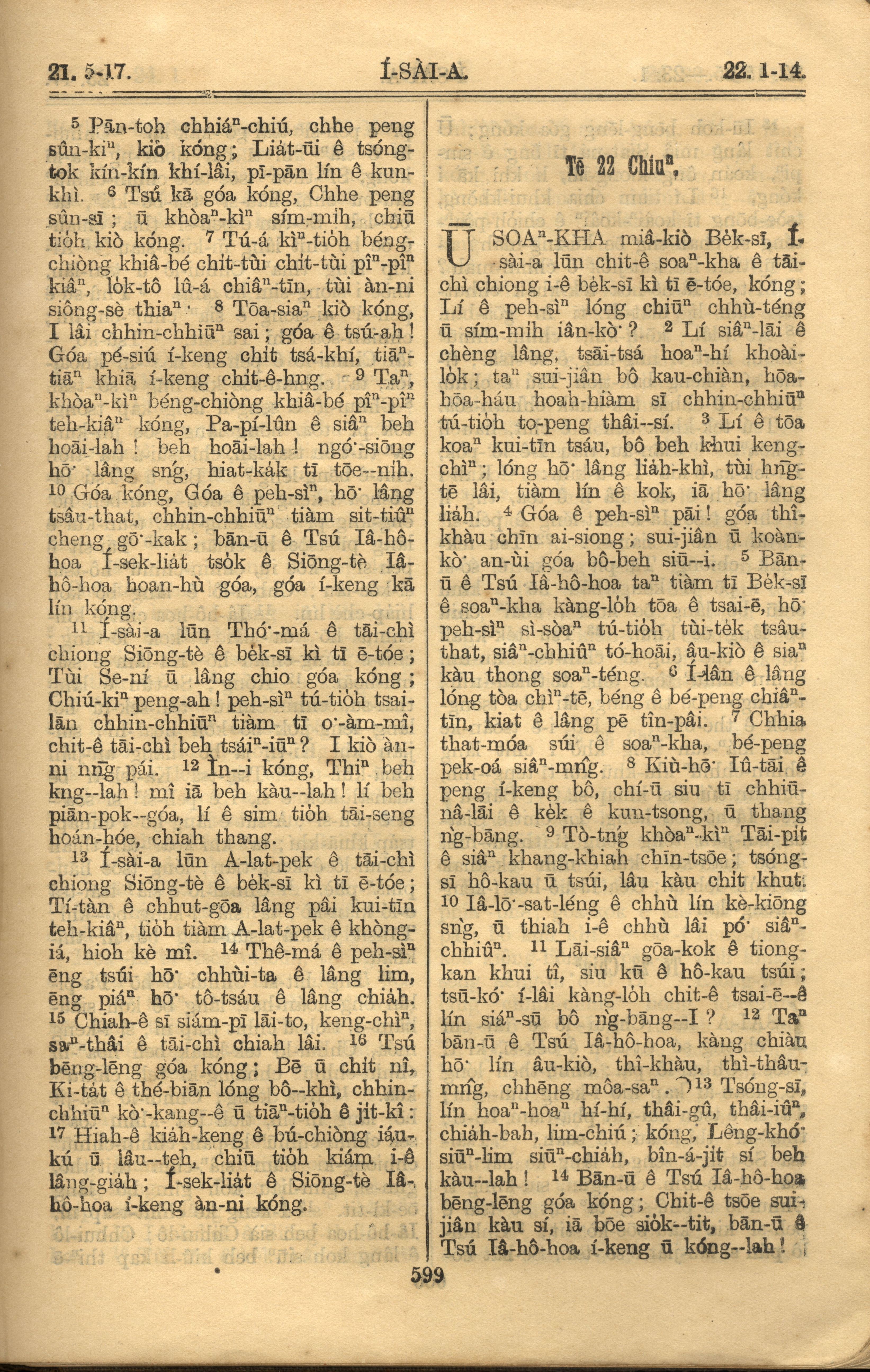 1921年罗马字旧约全书 以赛亚书 21 章 5 节到 22 章 14 节