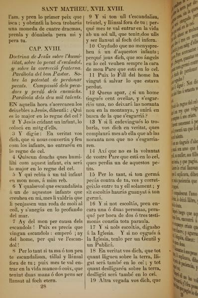 1835年加泰羅尼亞語新約全書 馬太福音 18 章 1 節到 18 章 19 節
