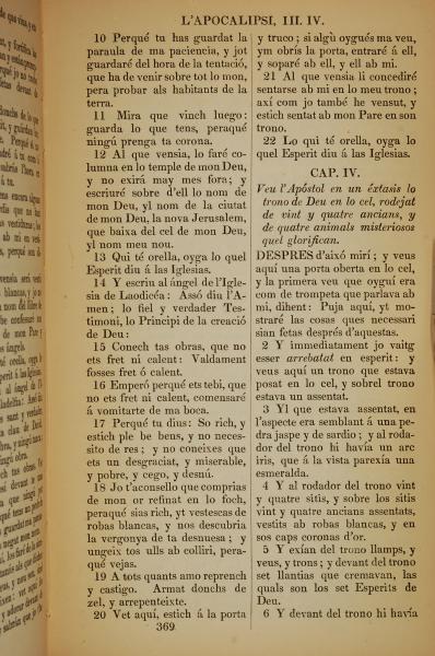 1835年加泰羅尼亞語新約全書 啟示錄 3 章 10 節到 4 章 6 節
