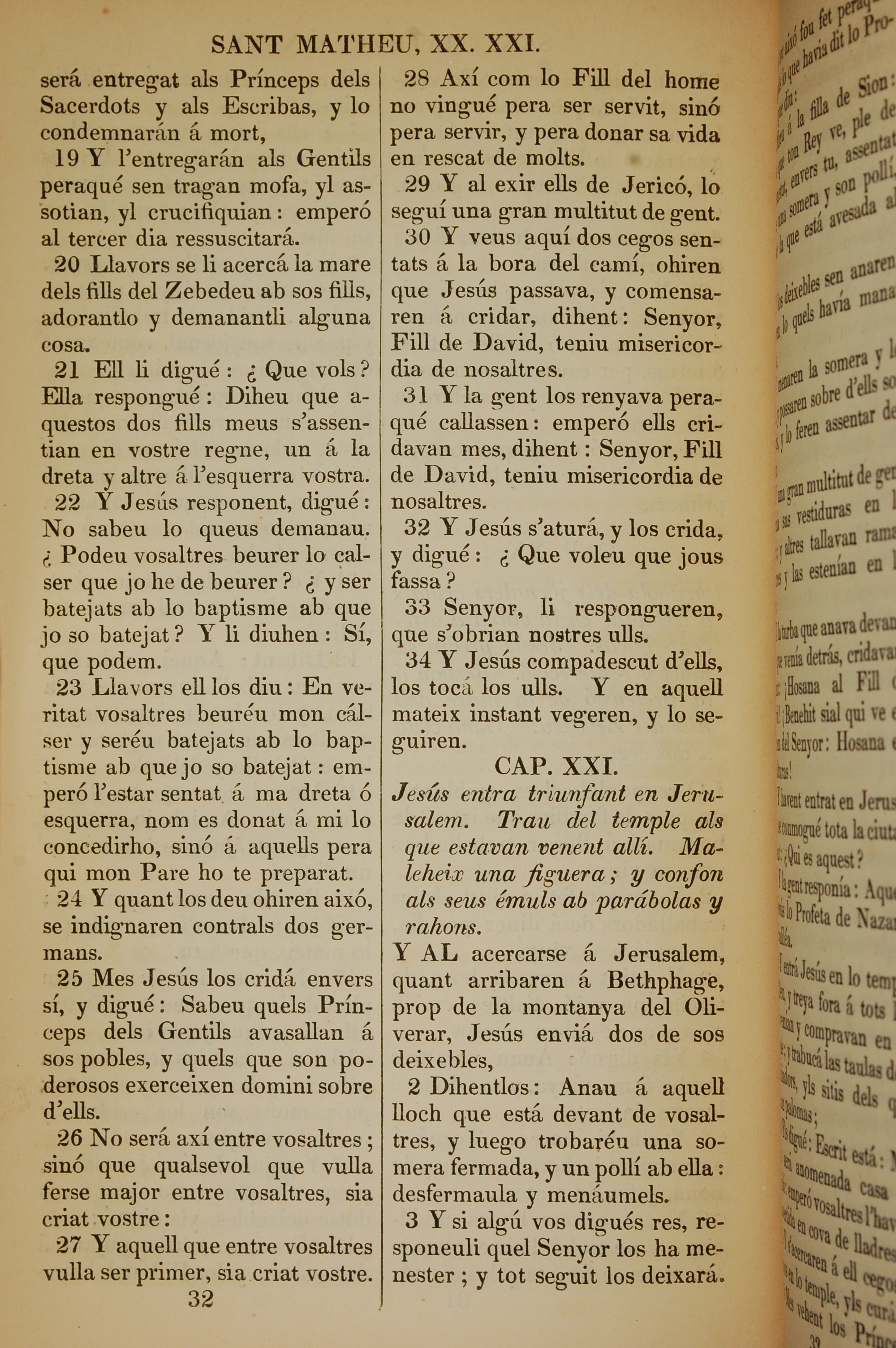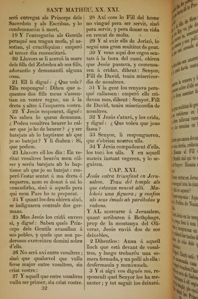 1835年加泰羅尼亞語新約全書 馬太福音 20 章 19 節到 21 章 3 節