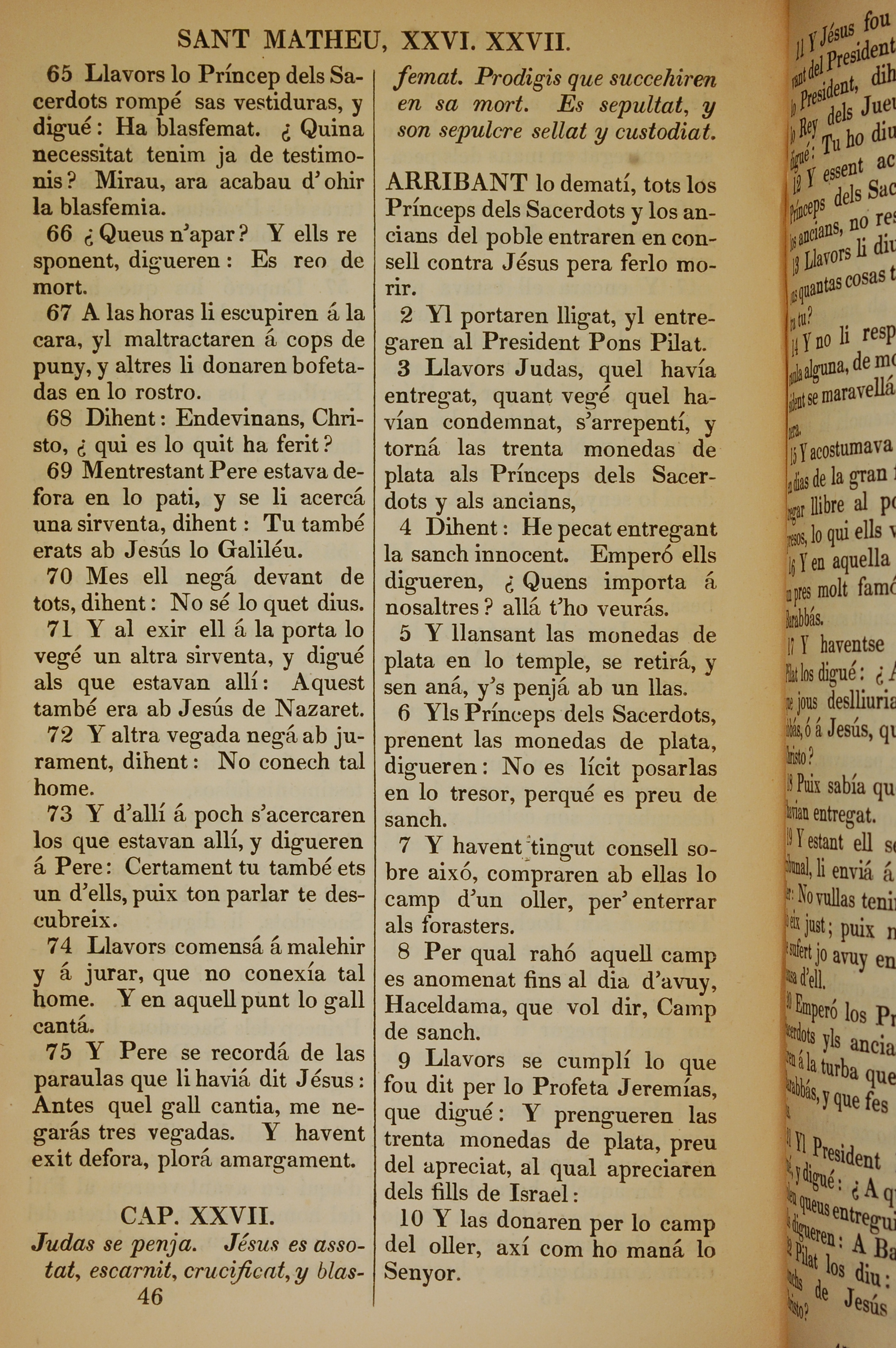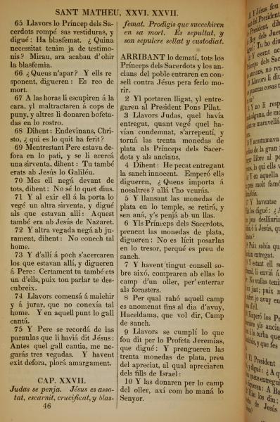 1835年加泰羅尼亞語新約全書 馬太福音 26 章 65 節到 27 章 10 節
