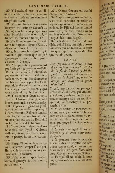 1835年加泰羅尼亞語新約全書 馬可福音 8 章 26 節到 9 章 5 節