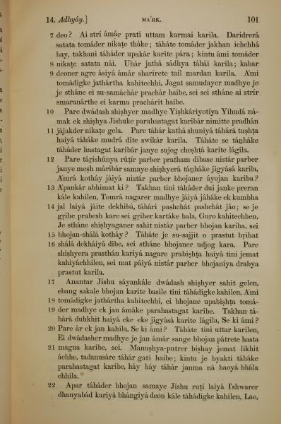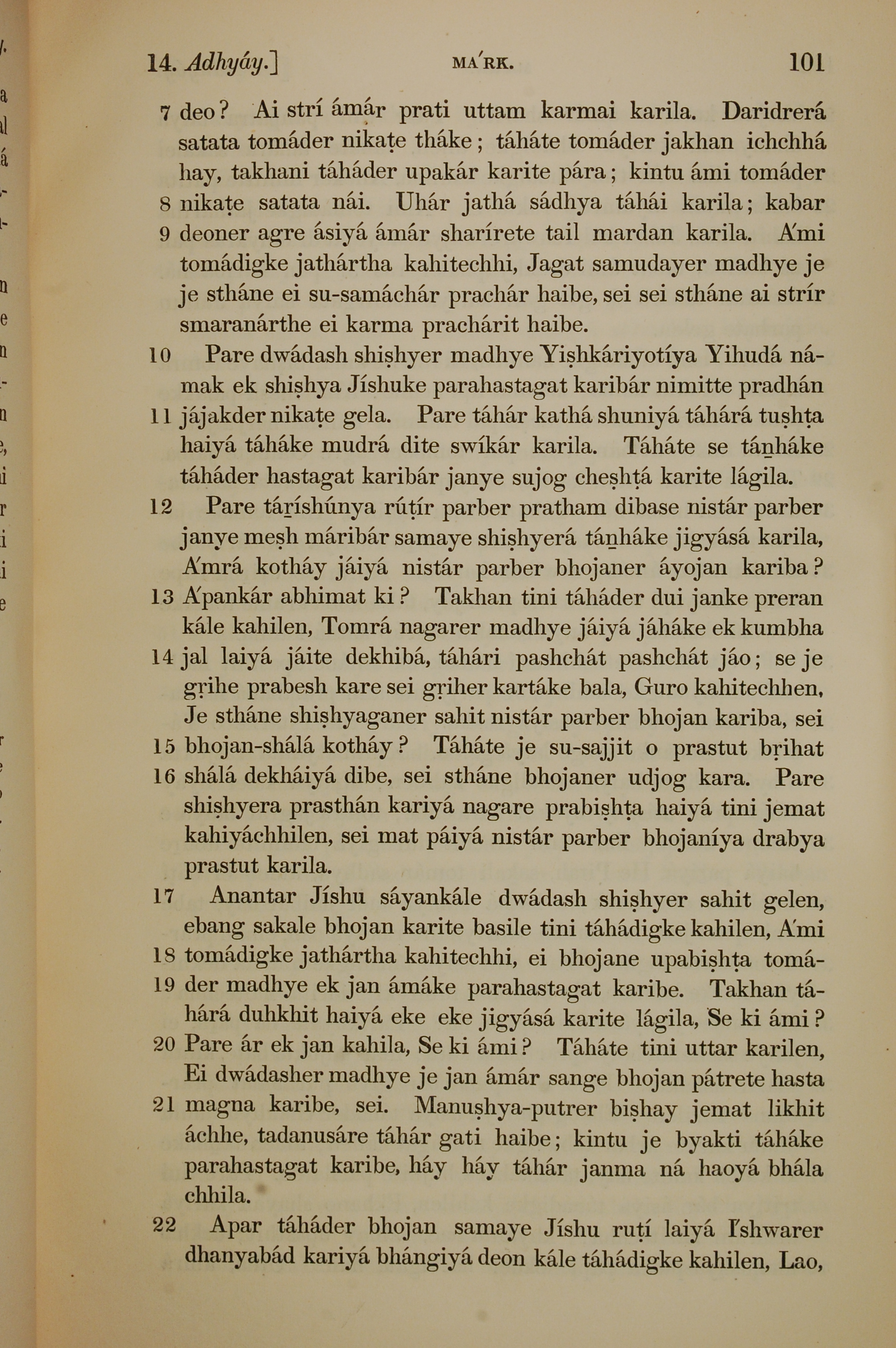 1839年孟加拉語新約全書 馬可福音 14 章 7 節到 14 章 22 節