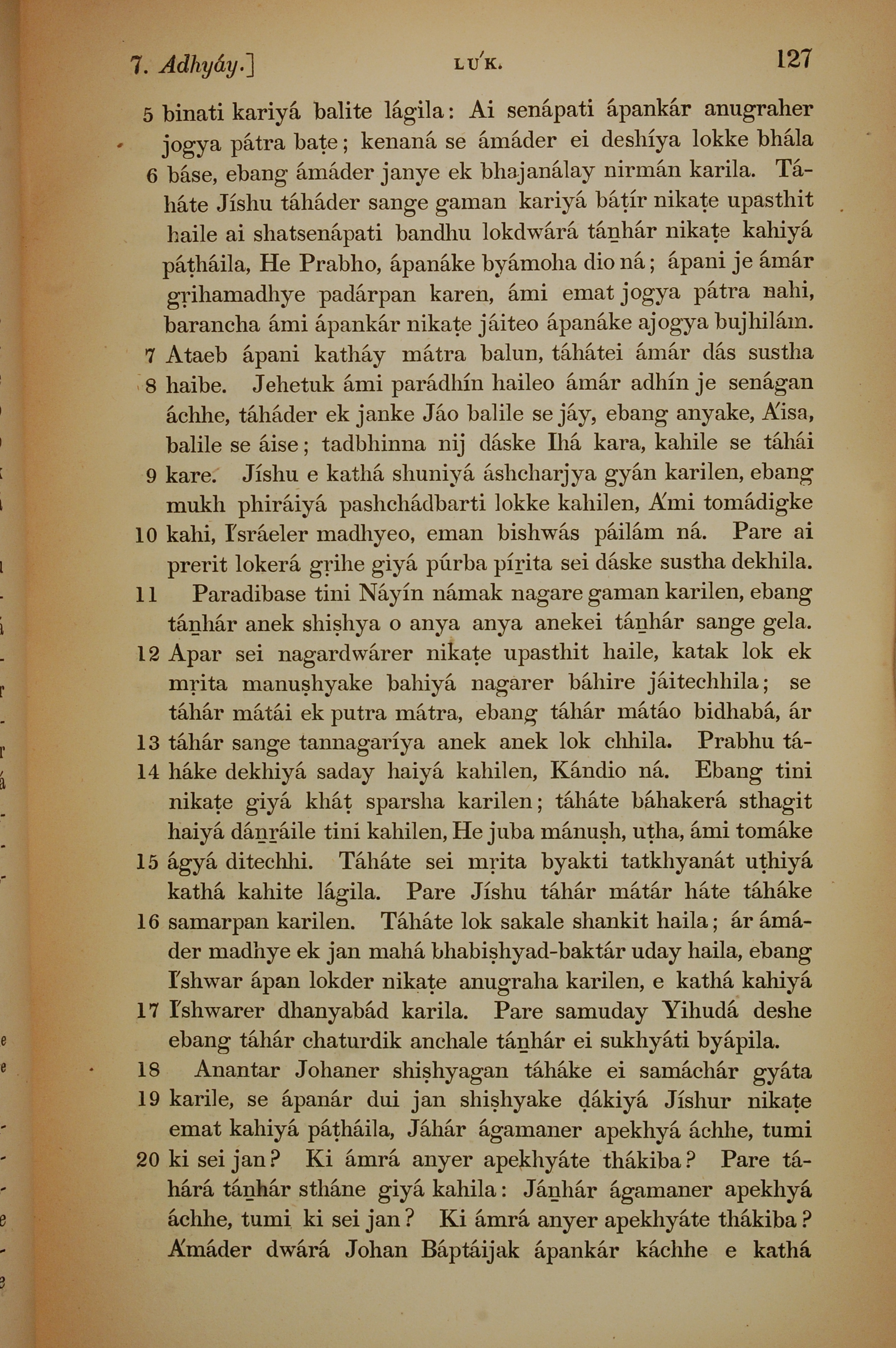 1839年孟加拉語新約全書 路加福音 7 章 5 節到 7 章 20 節