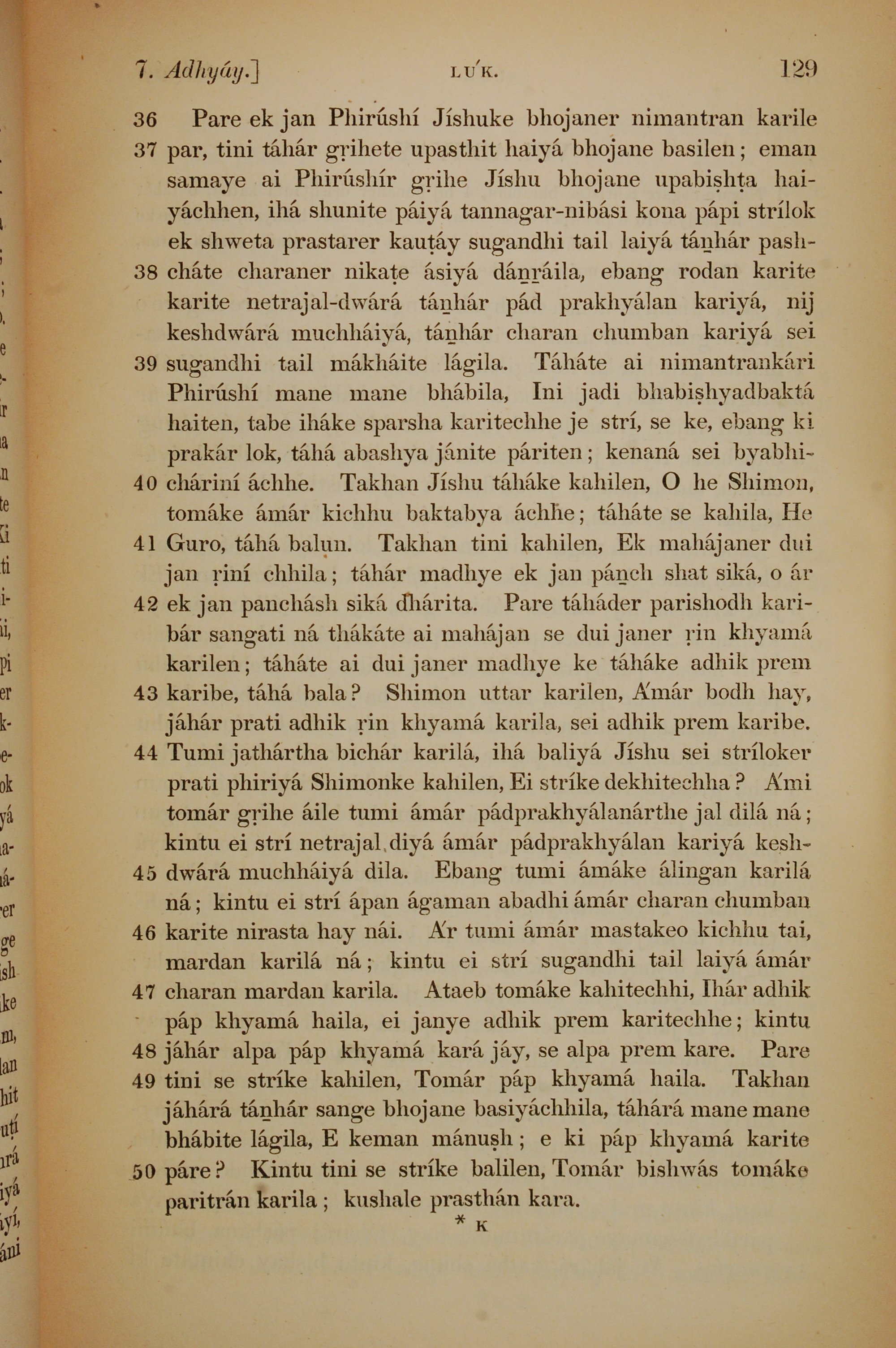1839年孟加拉語新約全書 路加福音 7 章 36 節到 7 章 50 節
