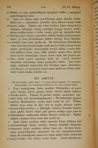 1839年孟加拉語新約全書 路加福音 13 章 30 節到 14 章 10 節