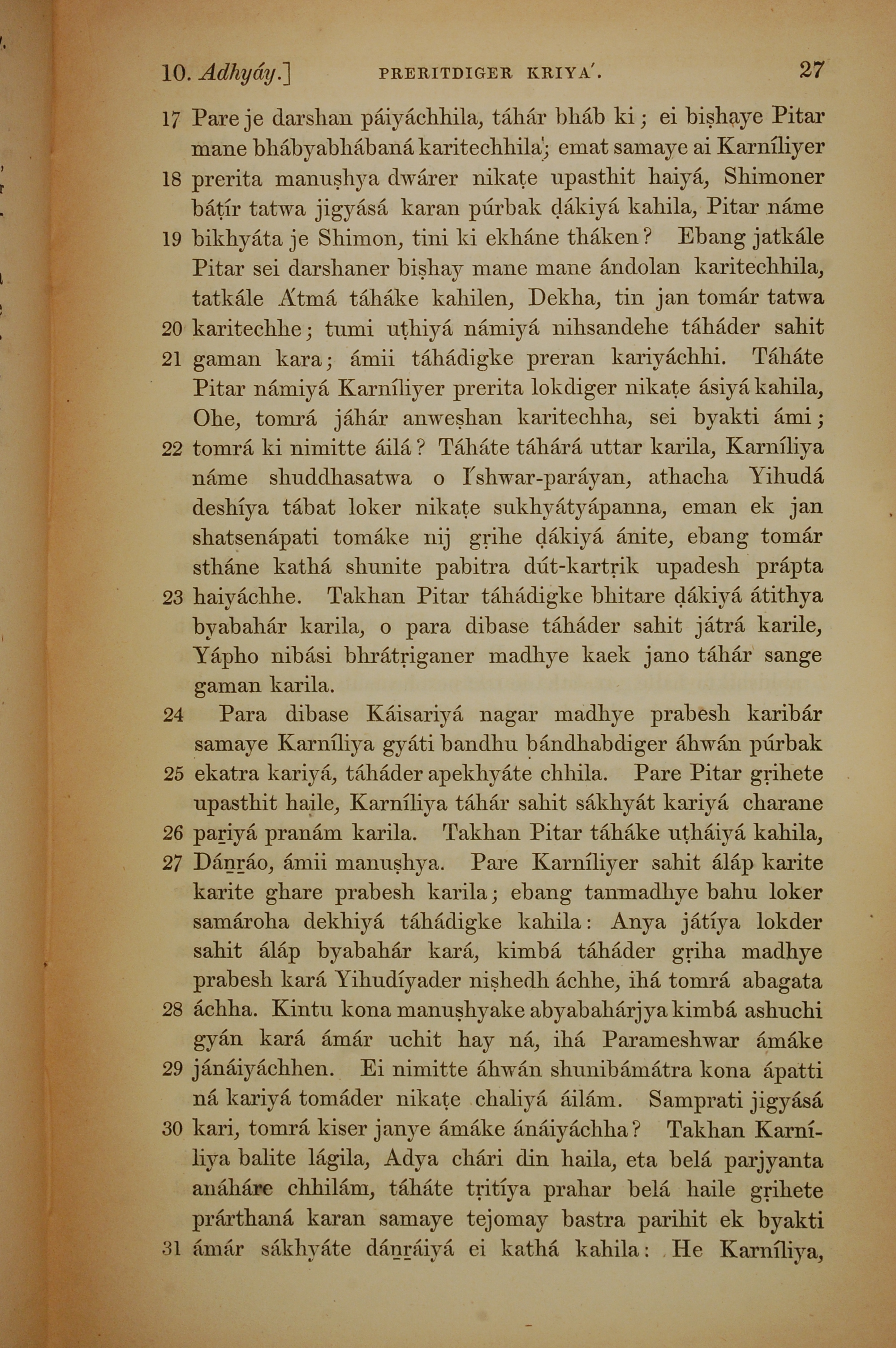 1839年孟加拉語新約全書 使徒行傳 10 章 17 節到 10 章 31 節