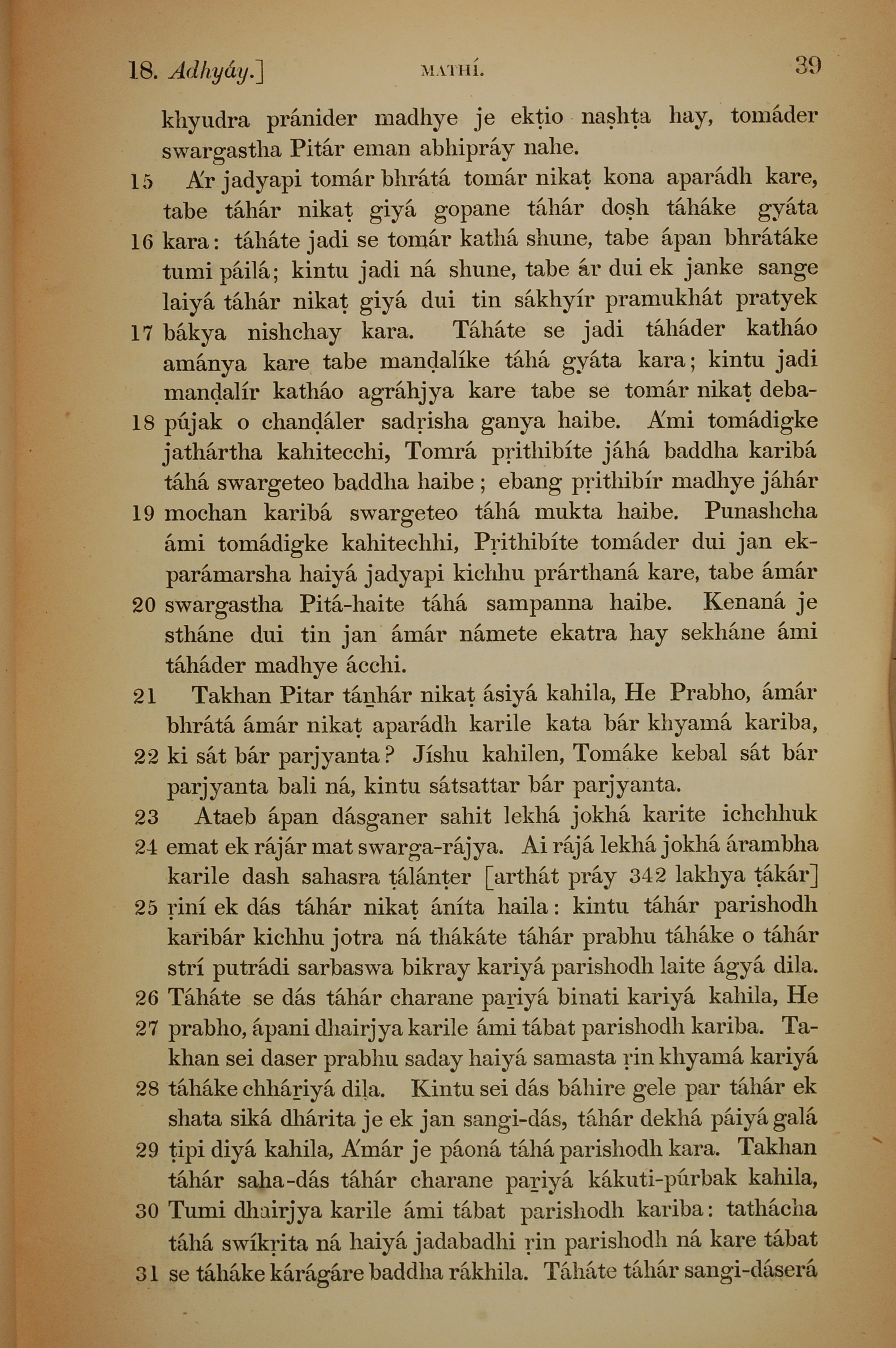 1839年孟加拉語新約全書 馬太福音 18 章 15 節到 18 章 31 節