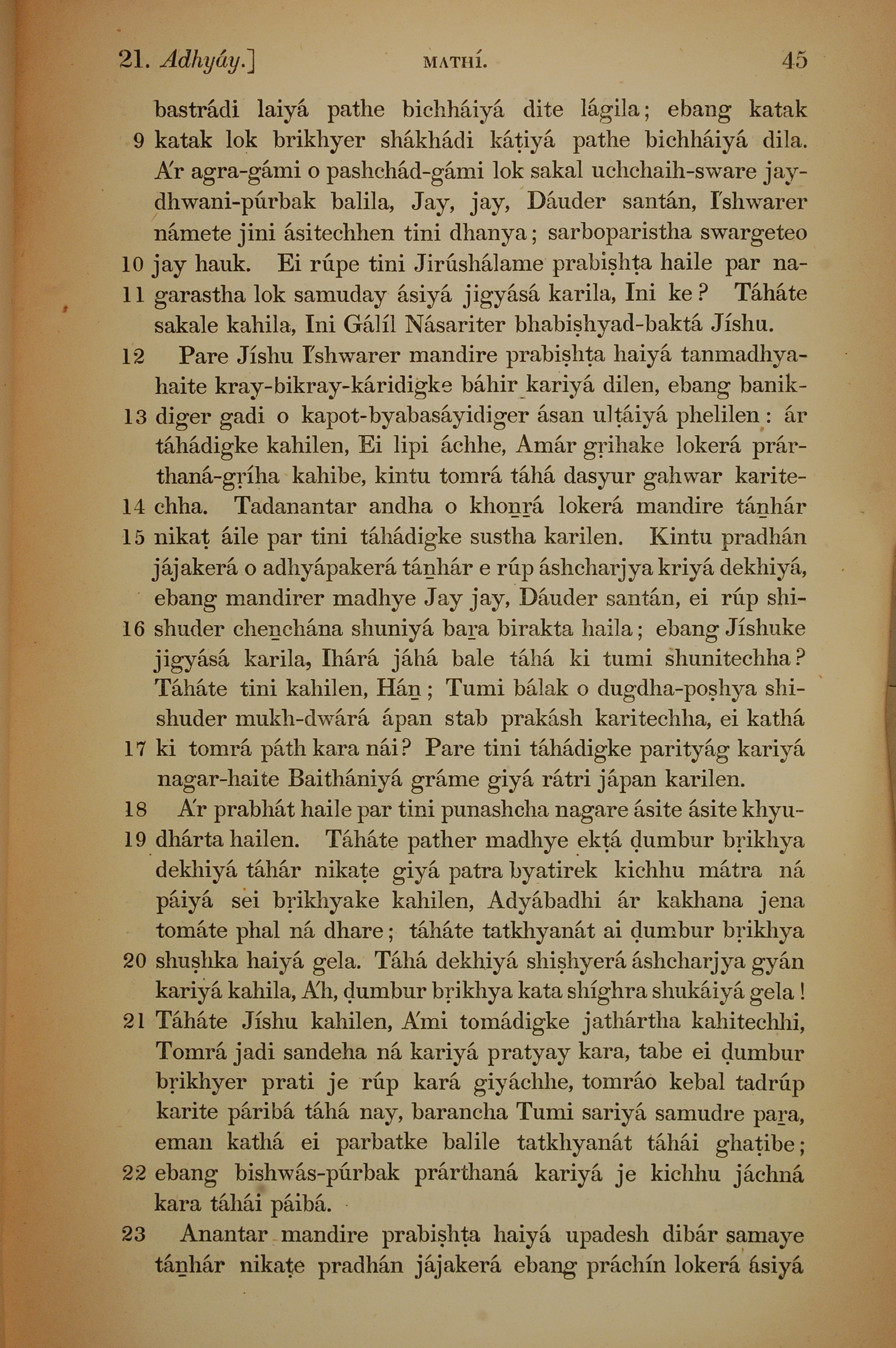 1839年孟加拉語新約全書 馬太福音 21 章 9 節到 21 章 23 節