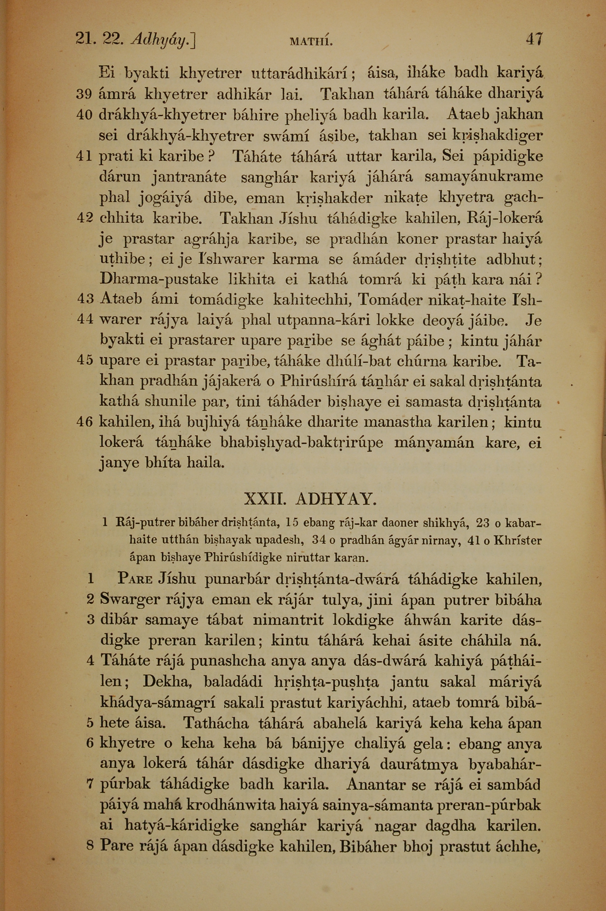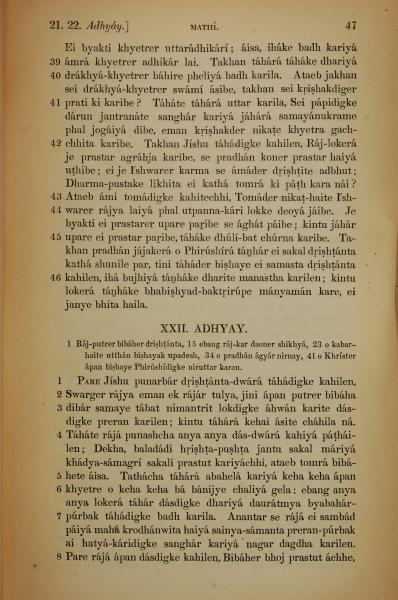 1839年孟加拉語新約全書 馬太福音 21 章 39 節到 22 章 8 節