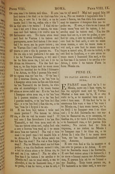 1853年塔希提語新約全書 羅馬書 8 章 24 節到 9 章 8 節