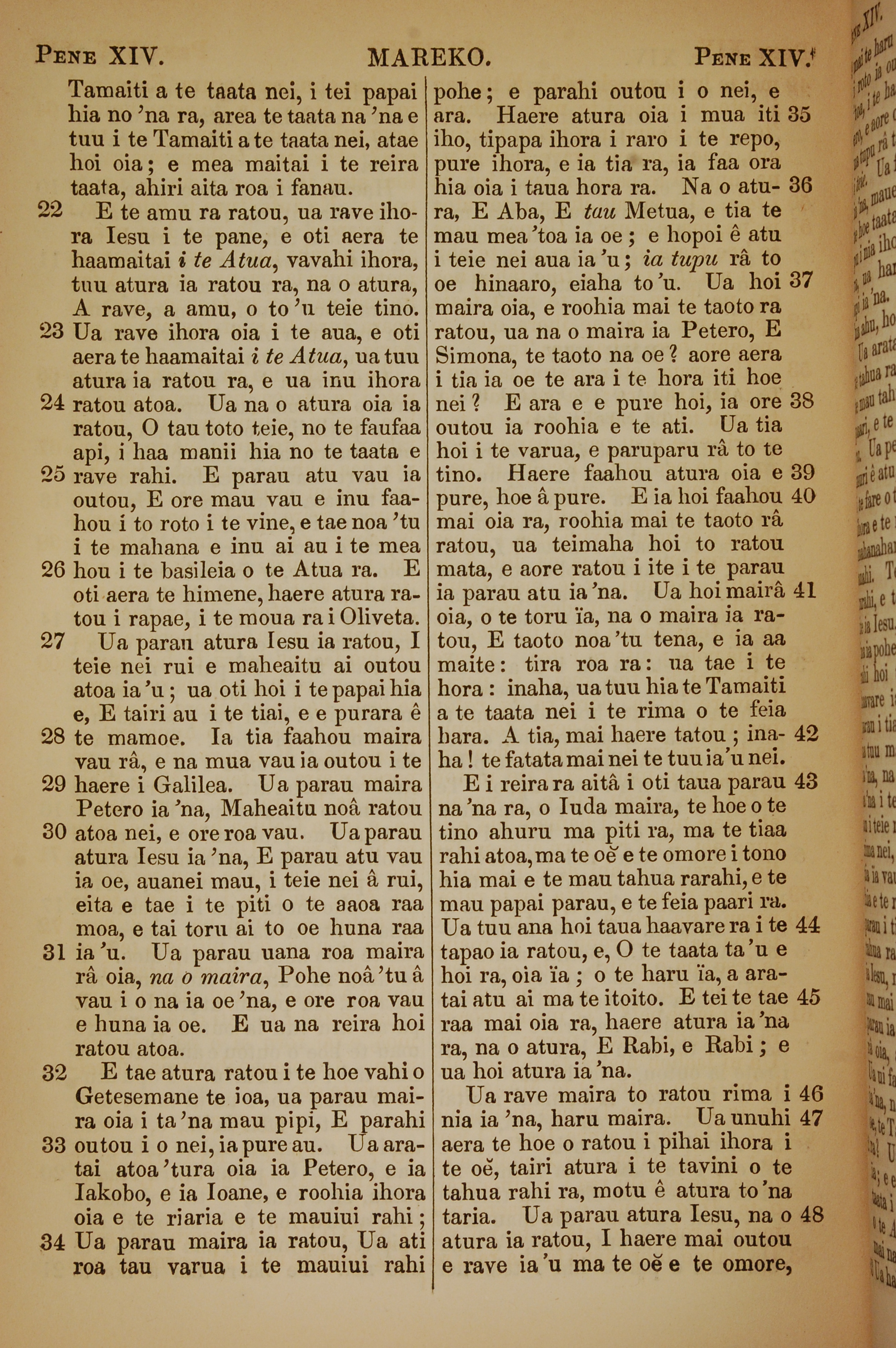 1853年塔希提語新約全書 馬可福音 14 章 22 節到 14 章 48 節