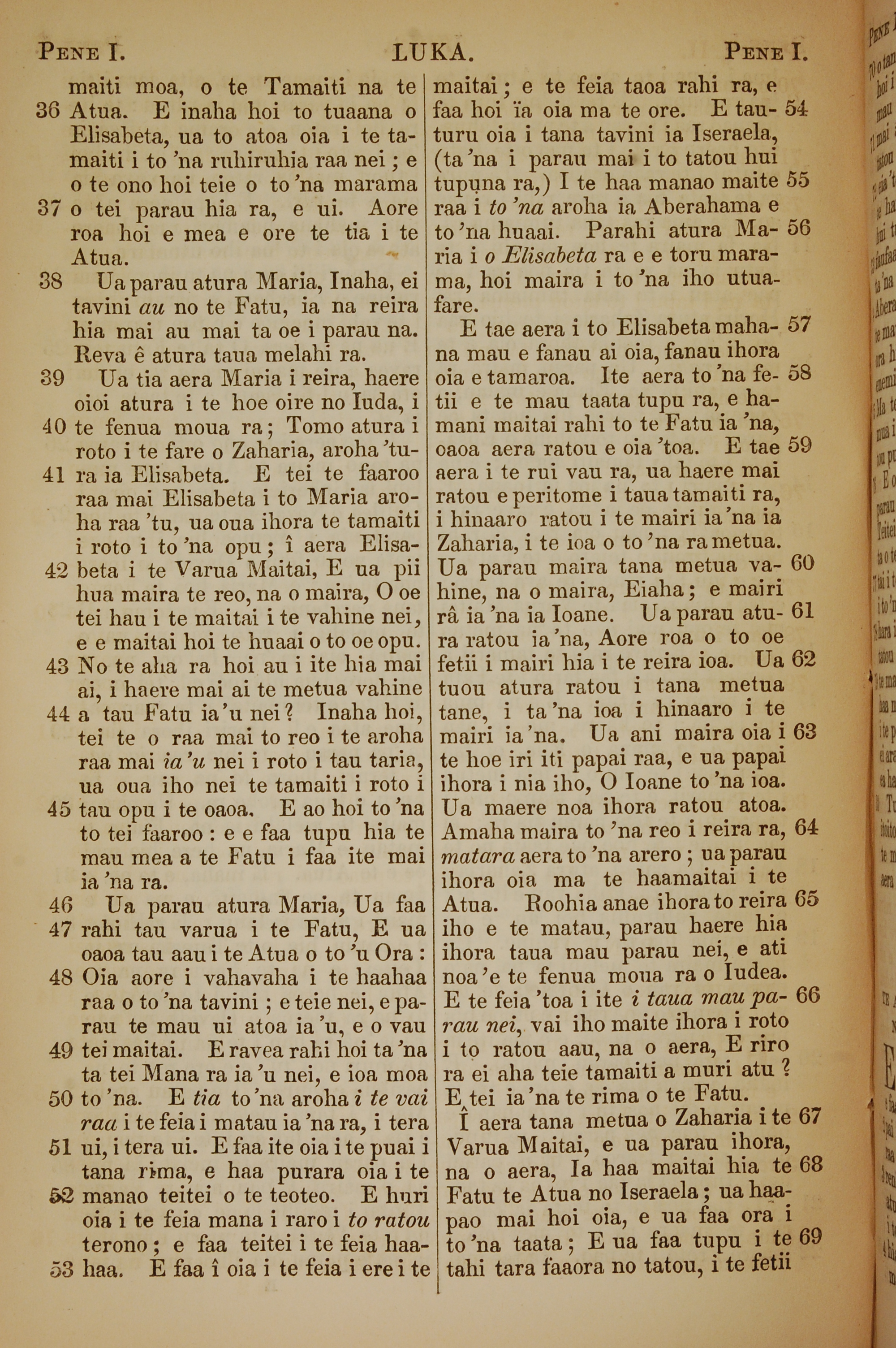 1853年塔希提語新約全書 路加福音 1 章 36 節到 1 章 69 節