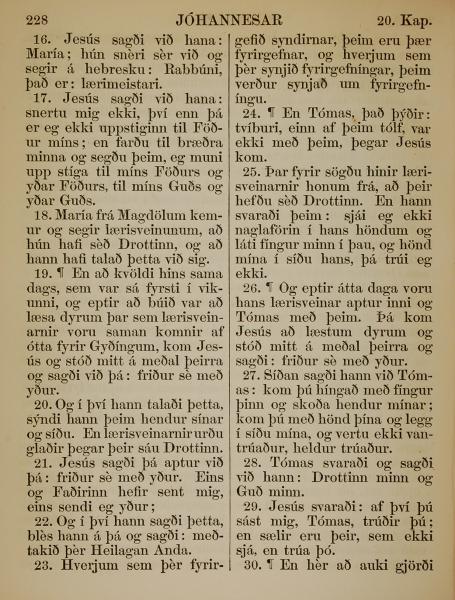 1863年冰島語新約全書 約翰福音 20 章 16 節到 20 章 30 節
