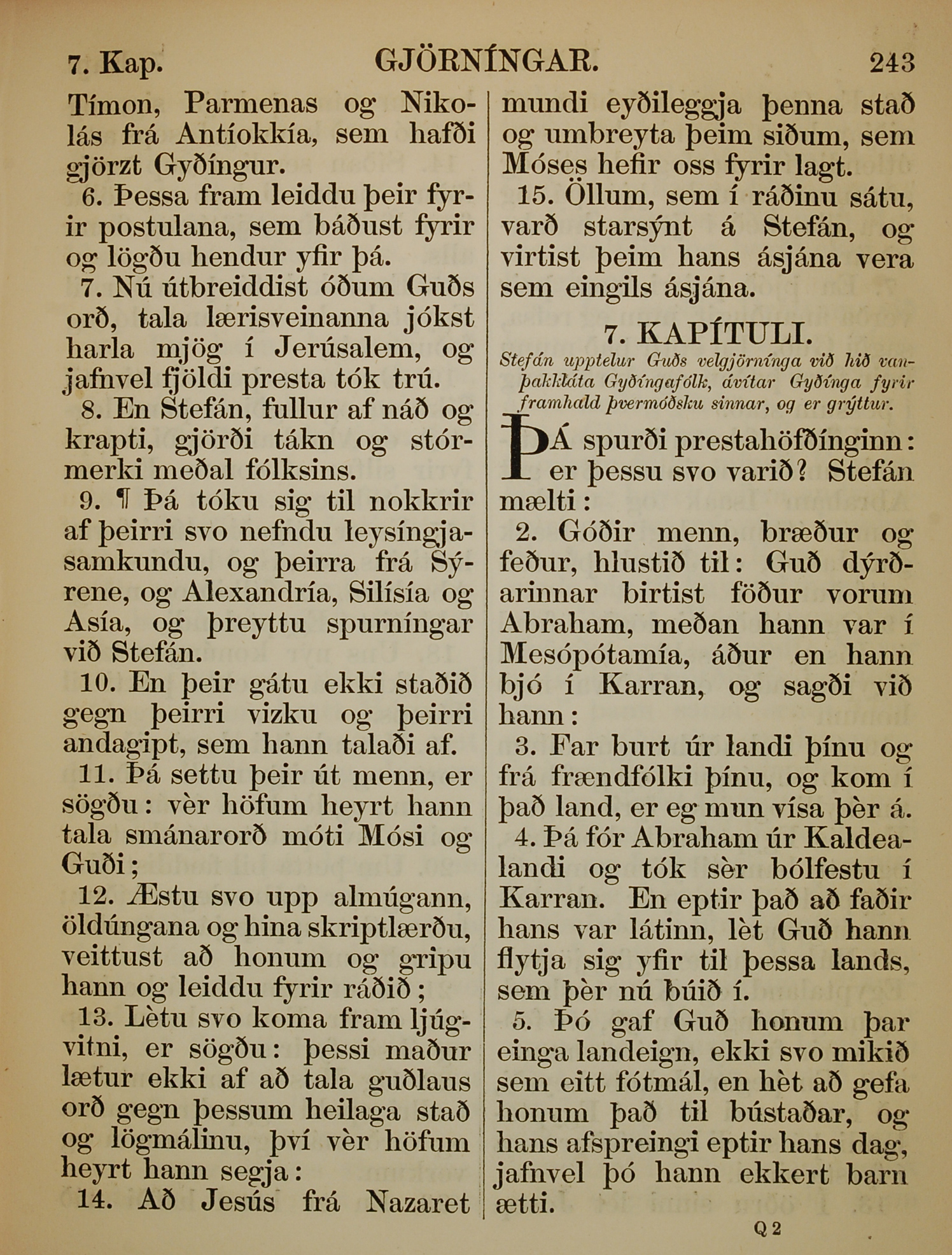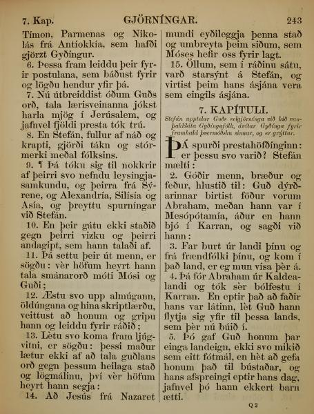 1863年冰島語新約全書 使徒行傳 6 章 6 節到 7 章 5 節