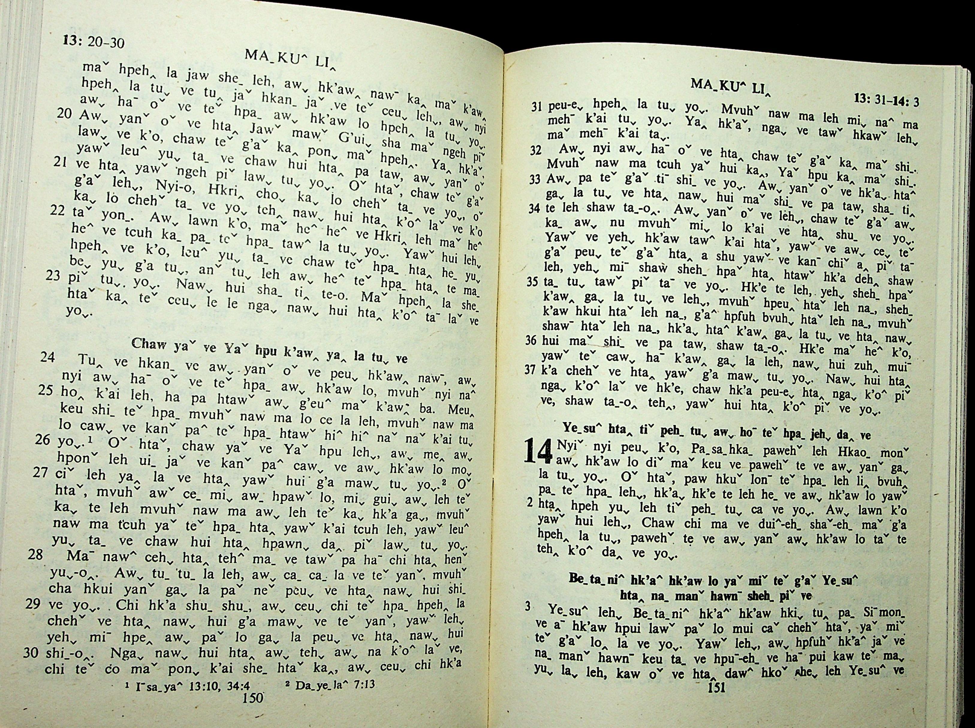 1985年拉祜文新約全書 馬可福音 13 章 20 節到 14 章 3 節